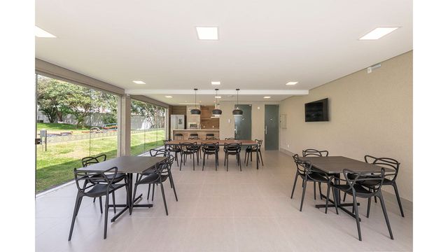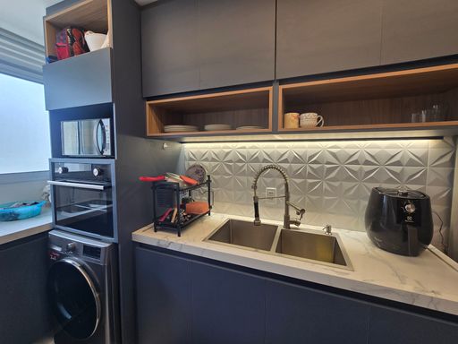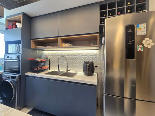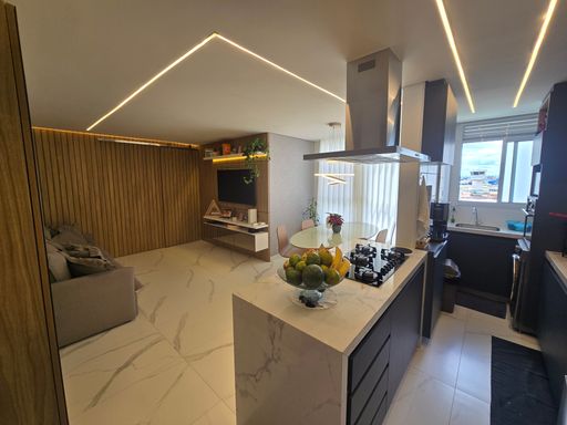 A sala é perfeita para receber amigos e família, enquanto os armários planejados garantem praticidade no dia a dia.