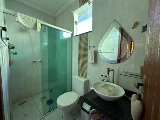 03 QUARTOS AMPLOS COM PISO EM CERÂMICA, SENDO 01 COM ARMÁRIOS PLANEJADOS, 01 COM VARANDA E 01 COM SUÍTE BANCADA EM GRANITO, BOX E ARMÁRIO PLANEJADOS, BANHEIRO SOCIAL, BANCADA EM GRANITO E BOX.